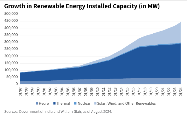 In addition, India’s renewable energy capacity installations have been growing at a staggering rate. Capacity additions of solar and wind have doubled since 2017, with 18 GW added in fiscal year 2024, to a total of nearly 200 GW of renewable energy capacity.